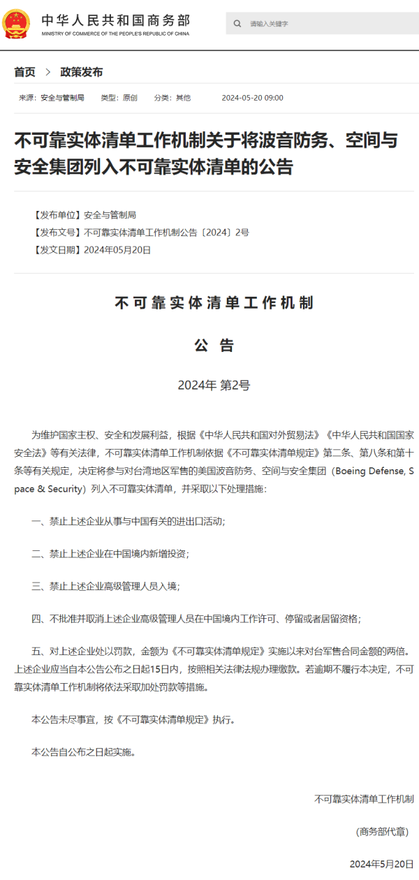 上证报中国证券网讯据商务部5月20日消息,商务部发布不可靠实体清单工作机制公告称,为维护国家主权、安全和发展利益,根据《中华人民共和国对外贸易法》《中华人民共和国国家安全法》等有关法律,不可靠实体清单工作机制依据《不可靠实体清单规定》第二条、第八条和第十条等有关规定正规配资杠杆平台2024,决定将参与对台湾地区军售的美国波音防务、空间与安全集团(Boeing Defense, Space u0026amp; Security)列入不可靠实体清单,并采取以下处理措施: 一、禁止......